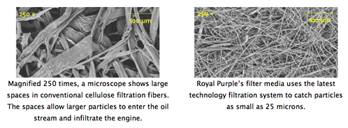 Royal Purple manufactures only one type of oil filter – the super-premium Extended Life Oil Filter, designed and engineered to match superior particle removal with optimized flow for maximum engine protection and filter life. Built smarter and stronger, Royal Purple synthetic oil filters continuously outperform in the toughest conditions. SUPERIOR FILTRATIONThe 100% synthetic micro-glass media we use to make Extended Life filters provides superior particle removal – with 99% filtration efficiency at as small as 25 microns. The difference between Royal Purple and conventional oil filters is staggering: |